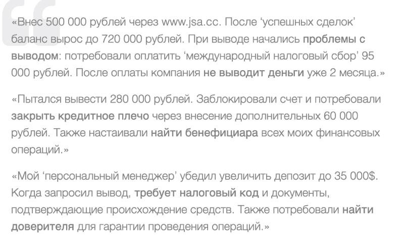 Схемы, по которым работает Jsa, типичны для множества фиктивных инвестиционных проектов. Сначала — громкие обещания, демонстрация «высокой доходности» и видимость стабильной работы, а затем — блокировка счетов и невозможность вернуть вложенные средства.